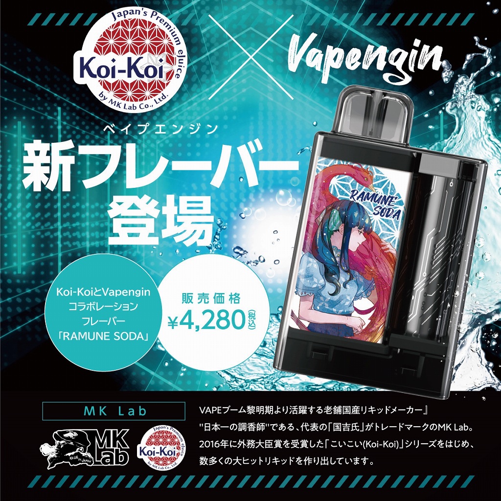 持ち運びシーシャ(使い捨てVape )のVapengin新フレーバーは、なんと!老舗リキッドメーカーMKLabのKoi-Koiとのコラボです!